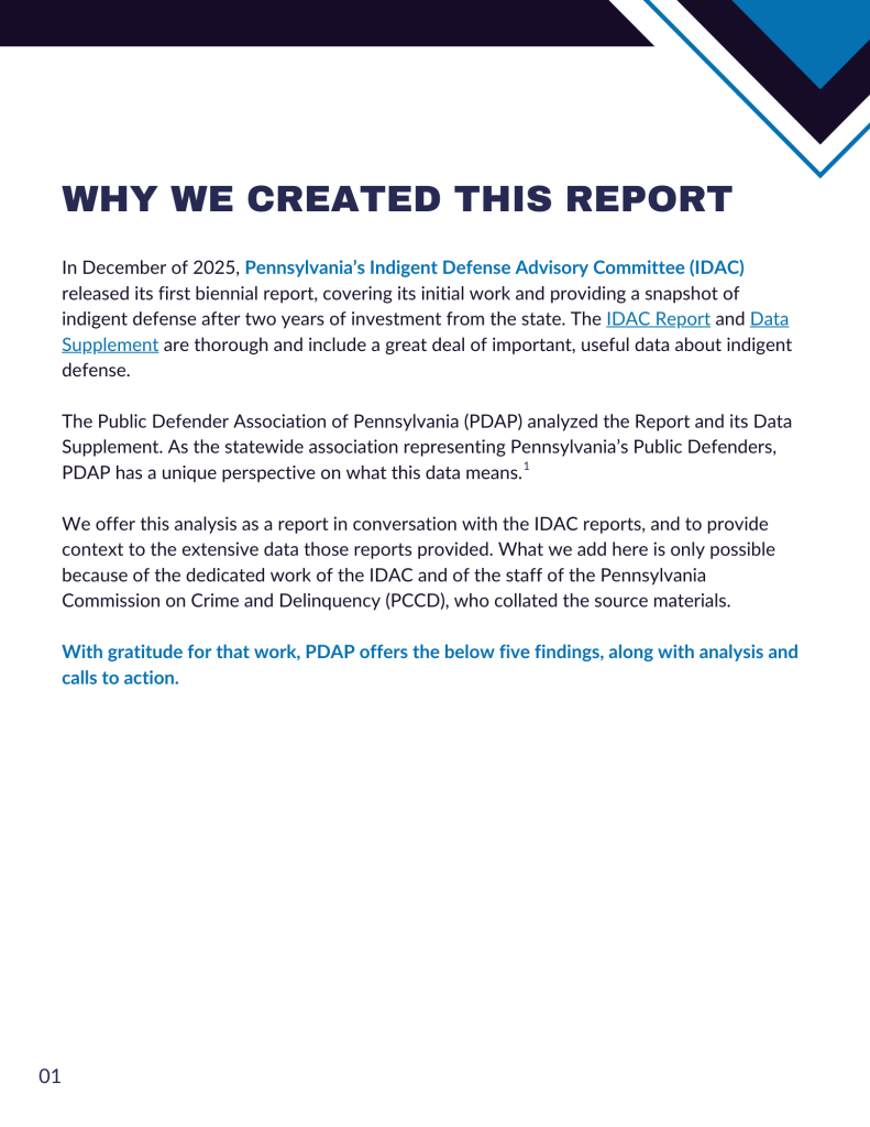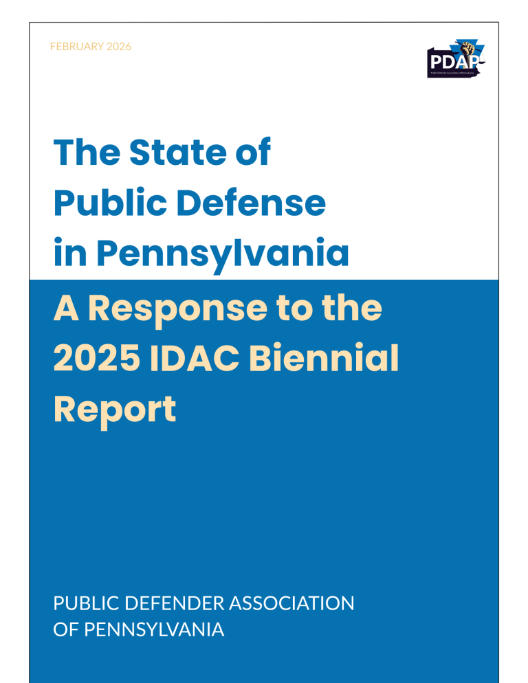 February 18, 2026 – PDAP is proud to present The State of Public Defense in Pennsylvania, a new report that identifies areas of improvement and recommendations to strengthen the infrastructure of public defense across Pennsylvania.