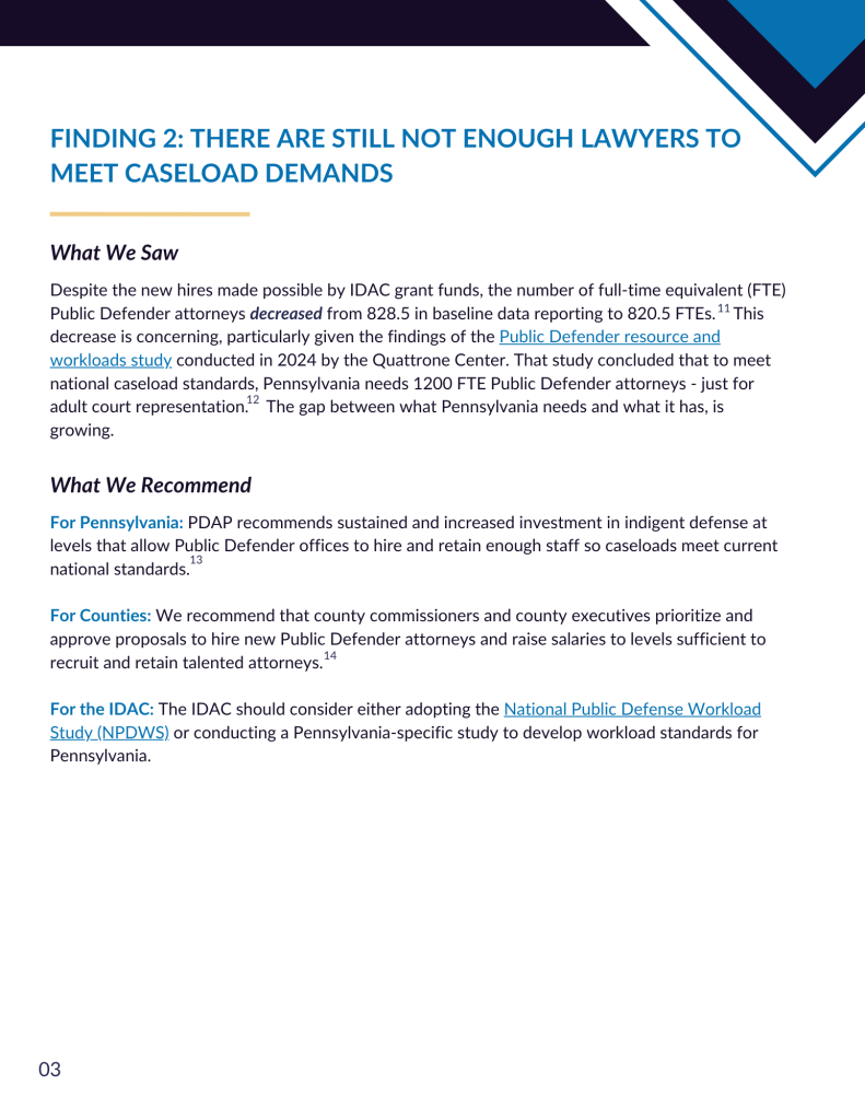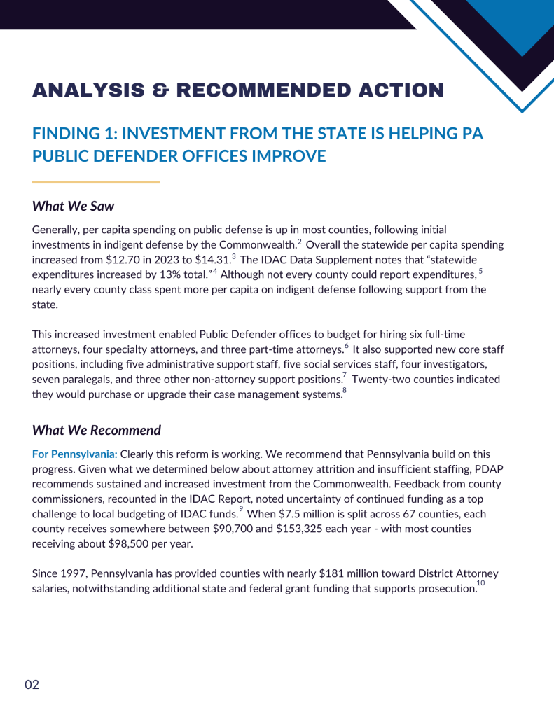 The State of Public Defense in Pennsylvania presents key findings from the IDAC report along with recommendations for county Public Defender’s offices, the IDAC, and the Commonwealth to consider as they all work to improve the quality of public defense in PA. It points out that per capita spending on public defense has increased in most counties over the past two years. Thanks to state funding, Public Defender offices have managed to hire more attorneys, as well as core support staff like investigators and social service advocates. However, PDAP’s report also raises concerns about issues that have not improved, from insufficient attorney staffing and retention to low numbers of cases tried and appealed in multiple counties. The report asks for Pennsylvania to provide more indigent defense funding, aiming for pay parity for Public Defender and District Attorney offices.